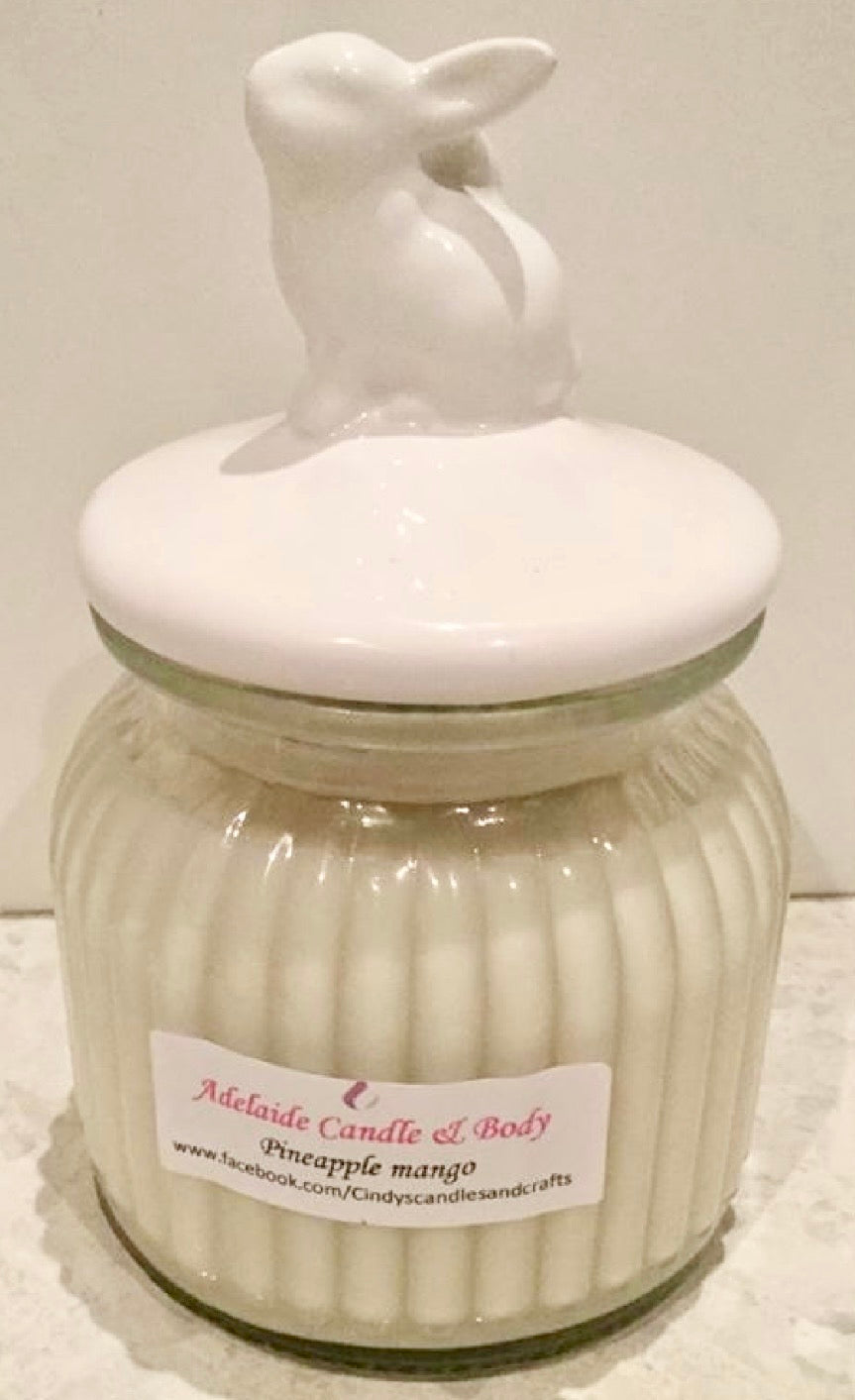 Gorgeous Easter candles with a bunny on top. Holds 600 gms of scented soy wax. made up candles are the lovely scent of pineapple mango or select your own scent from the fragrances and confirm it in an email.