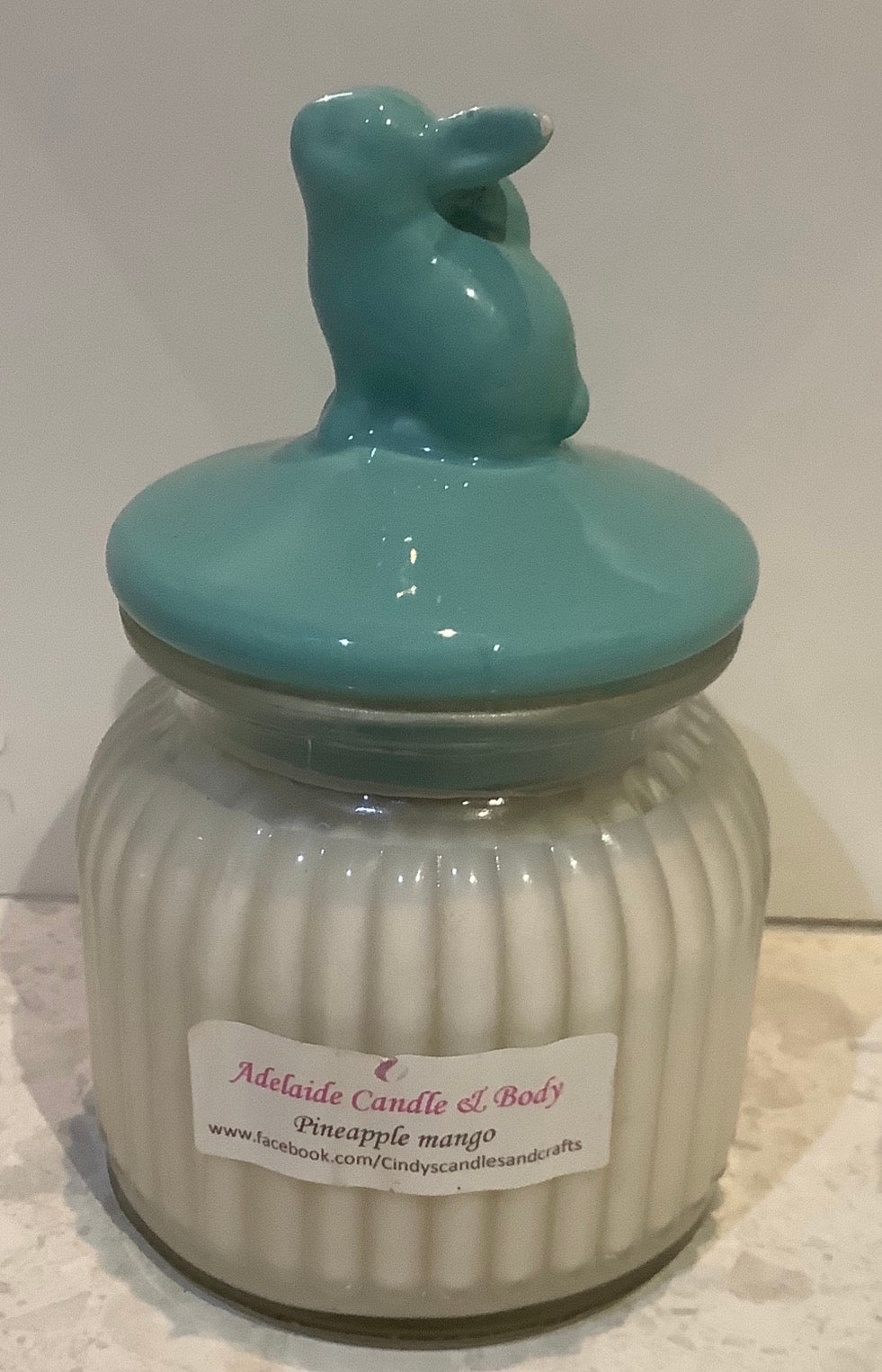 Gorgeous Easter candles with a bunny on top. Holds 600 gms of scented soy wax. made up candles are the lovely scent of pineapple mango or select your own scent from the fragrances and confirm it in an email.